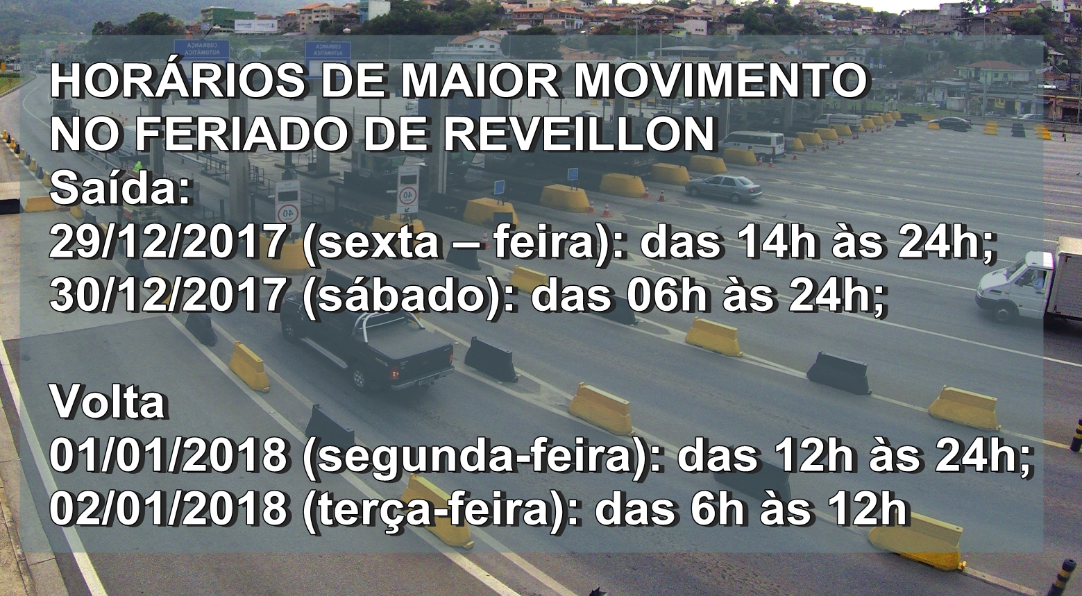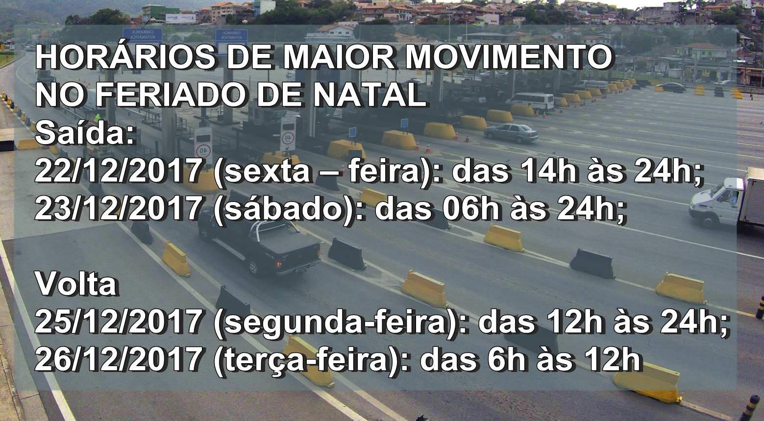 Começou o movimento nas rodovias para as festa de fim de ano. A saída para o Natal deve ser intensificada na tarde desta sexta-feira (22) e durante todo o sábado. O mesmo deve ocorrer na semana que vem para a saída de Ano Novo. Segundo a concessionária Arteris Fernão Dias, a expectativa que mais de um milhão e meio de carros passem pela rodovia entre São Paulo e Belo Horizonte. A concentração do tráfego deve acontecer nos dois extremos da rodovia: entre Guarulhos e Bragança Paulista e entre Contagem e Igarapé (MG).