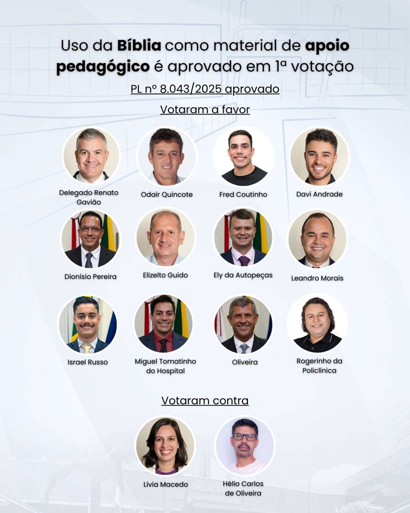 Os vereadores de Pouso Alegre, no Sul de Minas, aprovaram um projeto de lei que autoriza a utilização da Bíblia como material de apoio pedagógico em instituições de ensino da cidade. O Projeto de Lei nº 8.043/2025 foi votado na sessão extraordinária desta segunda-feira (8/12).