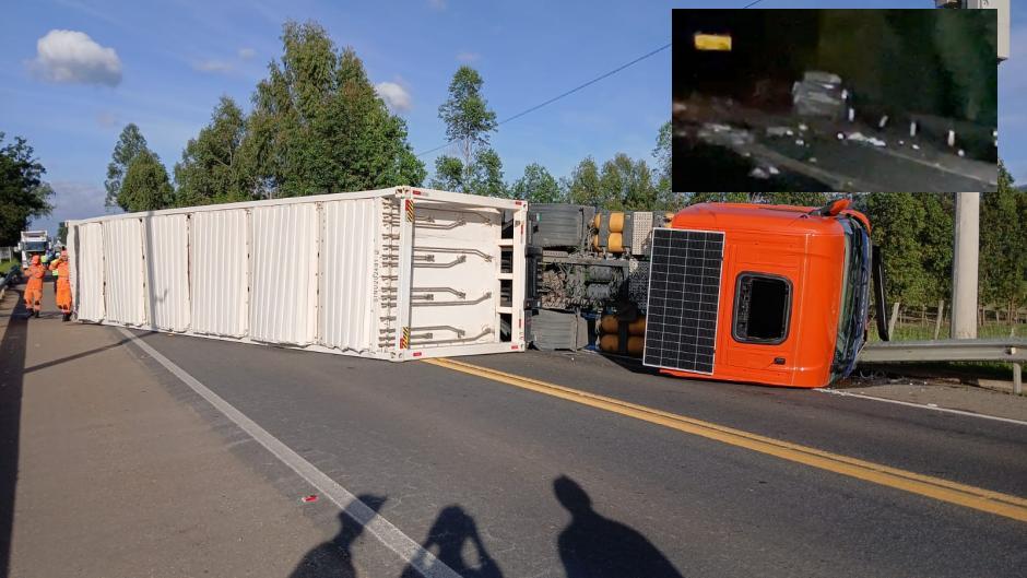 A picape parou após bater no guardrail e ficou destruída. A carreta tombou atravessada entre os dois sentidos da pista e bloqueia toda a rodovia. Ela transportava gás natural de Poços de Caldas para Extrema.