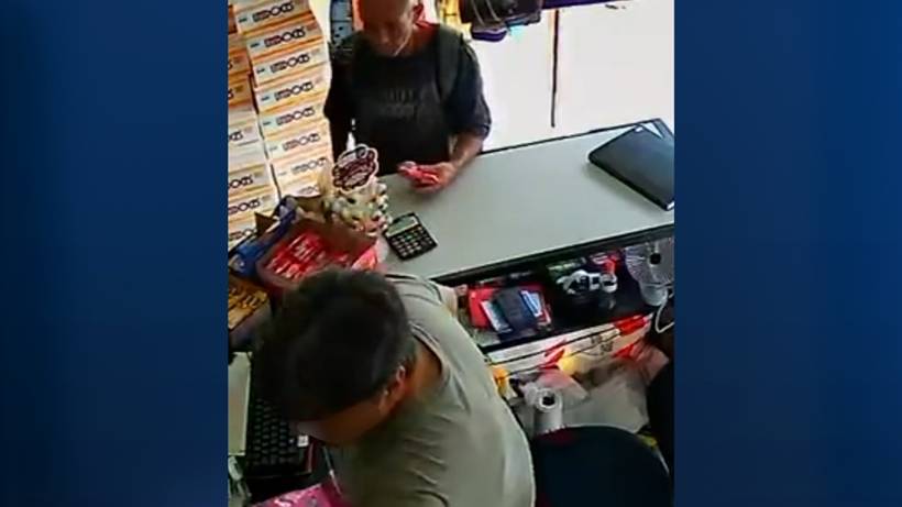 Veja que ele disfarça, conversa com o atendente e pega algo para comprar. Quando o atendente se vira, ele pega o produto no balcão e esconde. Em seguida, ele sai da loja tranquilamente.
