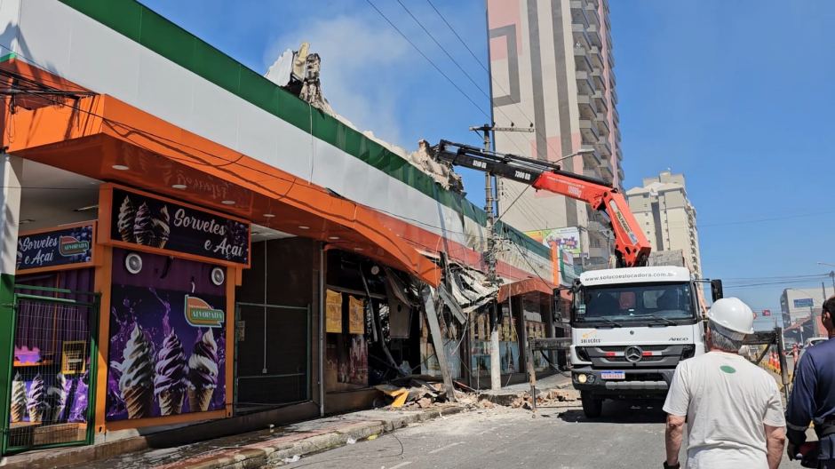 Após incêndio, fachada do Supermercado Alvorada é parcialmente demolida. Imagem Nayara Andery.
