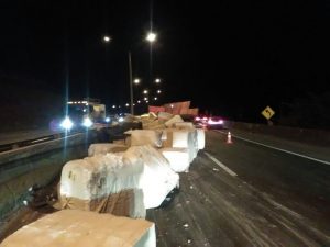 Segundo a Polícia rodoviária Federal, o motorista da carreta perdeu o controle da direção e bateu contra a mureta do canteiro centro. O veículo não chegou a tomar, mas a carga caiu e se espalhou sobre a pista. O motorista da carreta não teve ferimentos.