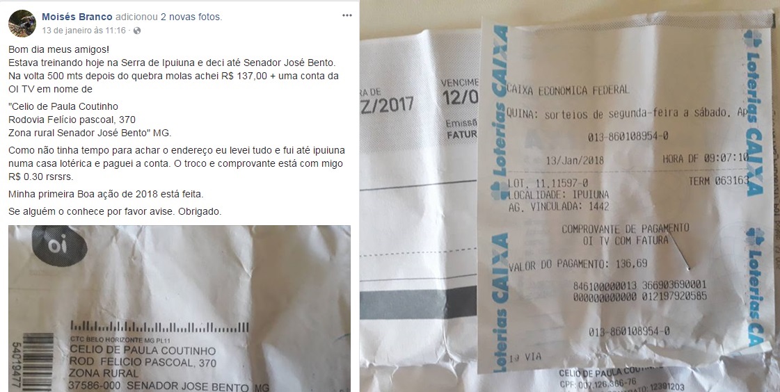 “Como não tinha tempo para achar o endereço eu levei tudo e fui até Ipuiúna, numa casa lotérica, e paguei a conta. O troco e comprovante está comigo: R$ 0.30”, escreveu Moisés Branco em sua rede social logo após chegar em casa.