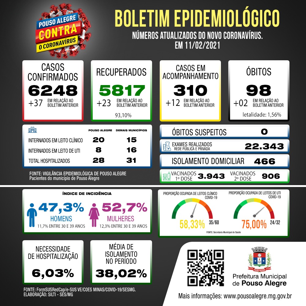 Neste momento, 5.817 cidadãos já se recuperaram da Covid-19, e 310 estão em acompanhamento. 59 pessoas estão internadas no Hospital das Clínicas Samuel Libânio, sendo que 28 são de Pouso Alegre e 31 de outros municípios que pertencem a Regional de Saúde de PA.