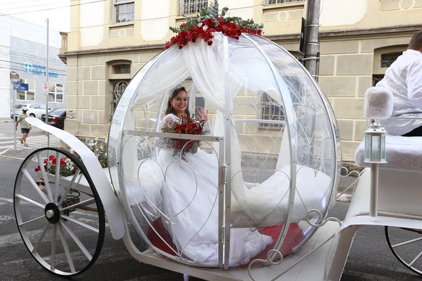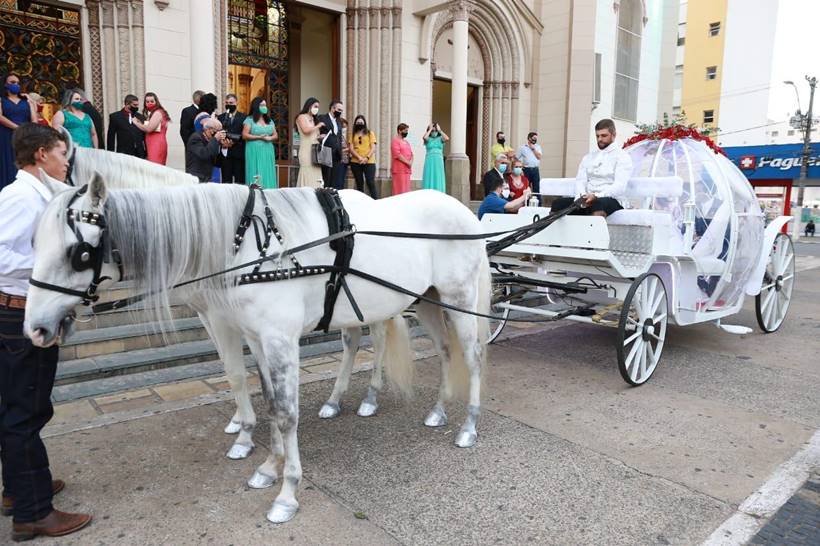 Advogada só soube da sua condução quando a carruagem estacionou em frente ao salão onde ela se arrumava. Casamento tinha sido adiado por causa da pandemia. VEJA FOTOS!