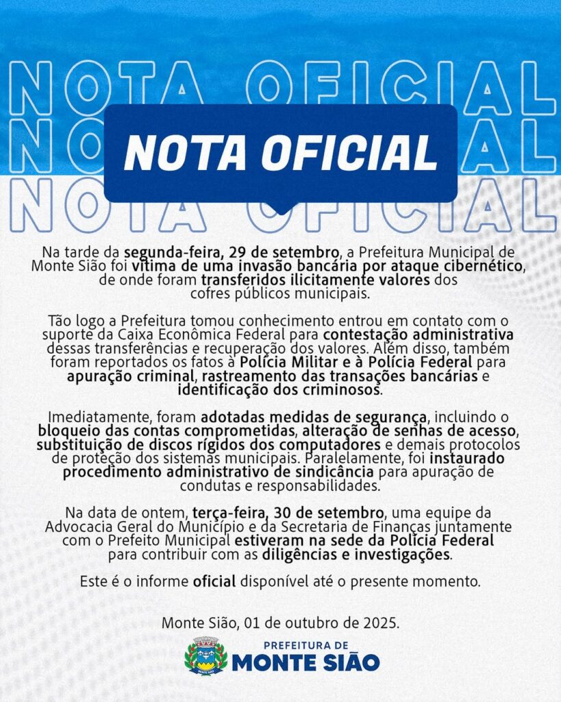 Em nota divulgada nas redes sociais, a Prefeitura disse tomou todas as medidas se segurança quando soube do ocorrido. Foi realizado o bloqueio de contas comprometidas, alteração de senhas de acesso, substituição de discos rígidos de computadores e demais protocolos de proteção dos sistemas municipais.