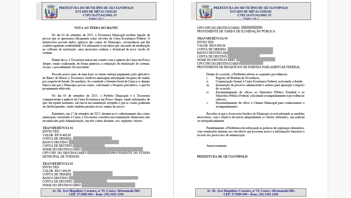 Prefeitura envia nota ao Terra do Mandu sobre o golpe nas contas públicas de Silvianópolis.