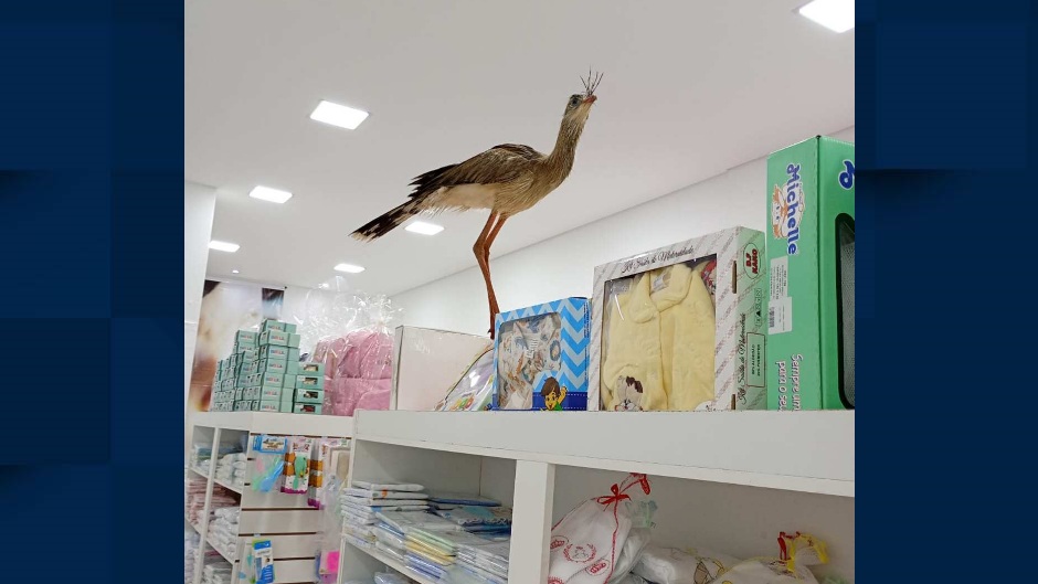 Siriema se abriga em loja e é resgatada em Pouso Alegre. Imagem Loja Bebê Chorão.