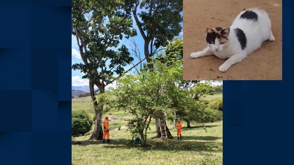 Uma gata chamada Juma ficou presa em uma árvore de cerca de 20 metros de altura, na zona rural de Gonçalves (MG). Bombeiros se deslocaram de Itajubá e resgataram a felina, nesta terça-feira (14/10).