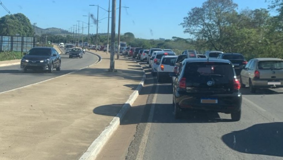 Espectador do Terra do Mandu registra congestionamento após acidente na Av. Dique 1, em Pouso Alegre.