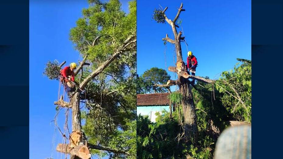Para fazer a supressão da árvore foram usadas motosserras, cordas, escadas, ferragens e equipamentos de proteção individual (EPI). A ocorrência foi encerrada com segurança, sem incidentes.