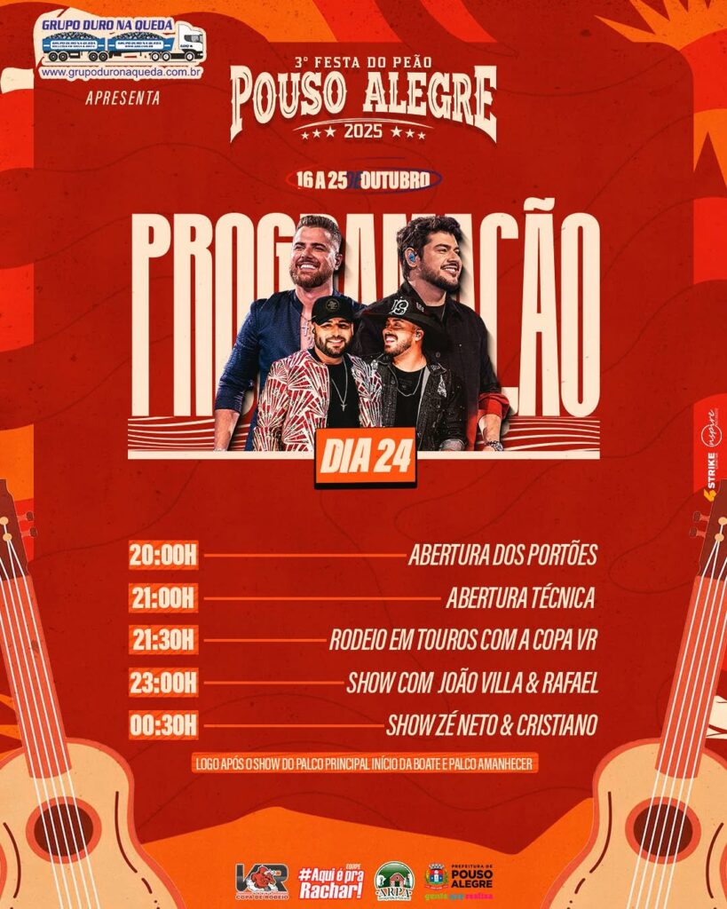Em Pouso Alegre, o grande show desta sexta-feira (24/10) será com Zé Neto & Cristiano. Os portões abrem às 20h e o show está marcado para 00h30. Às 21h acontece a abertura técnica, às 21h30 será o rodeio em touros com a Copa VR, e às 23h acontece show de João Villa Rafael.