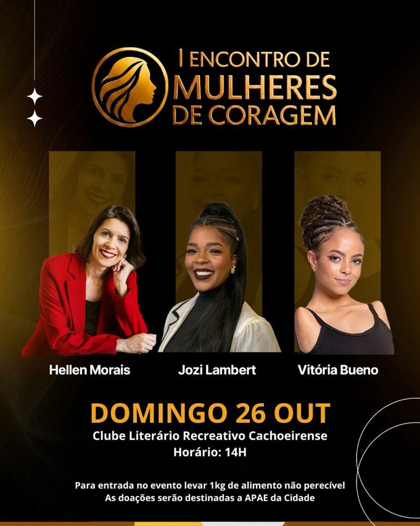 Em Cachoeira de Minas acontece o I Encontro de Mulheres de Coragem. Haverá palestra com a bailarina Vitória Bueno em Cachoeira de Minas, no domingo. O Projeto foi idealizado com o propósito de fortalecer a relação entre mulheres empreendedoras/profissionais/artesãs, mães de famílias, o que não exclui pequenas jovens que buscam reconhecimento no início de vida profissional. Palestram ainda Hellen Morais e Jozi Lambert.