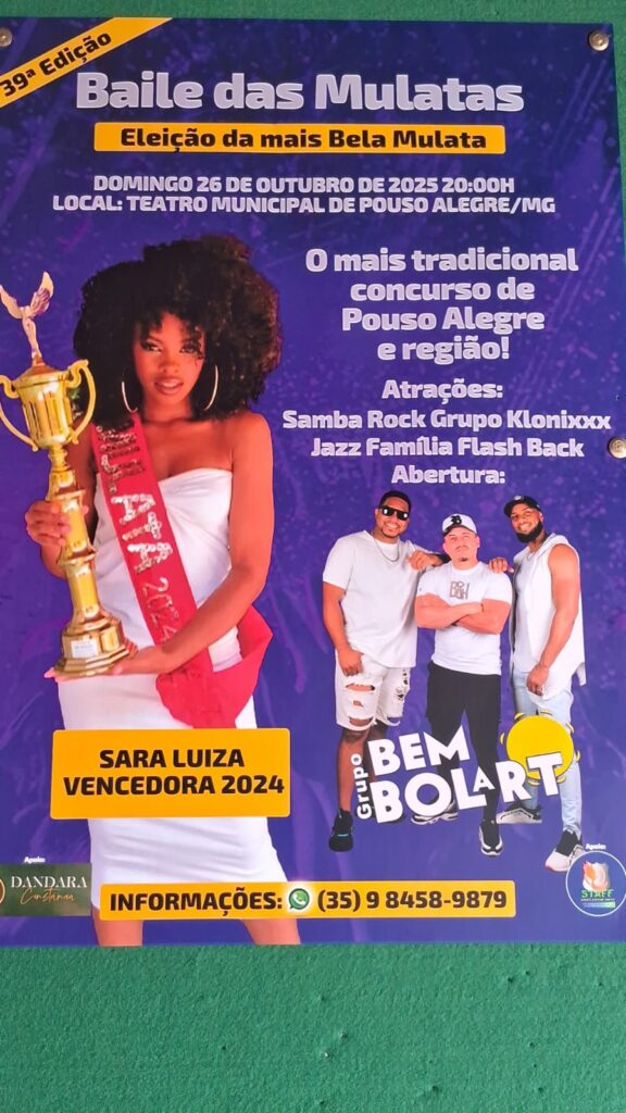 Ainda no Teatro Municipal, o tradicional Baile das Mulatas acontece no domingo (26), às 20h, celebrando a beleza negra. Será uma noite com atrações musicais e eleição da mais bela mulher negra de Pouso Alegre e região. Ingressos podem ser adquiridos pelo WhatsApp (35) 98458-9879.