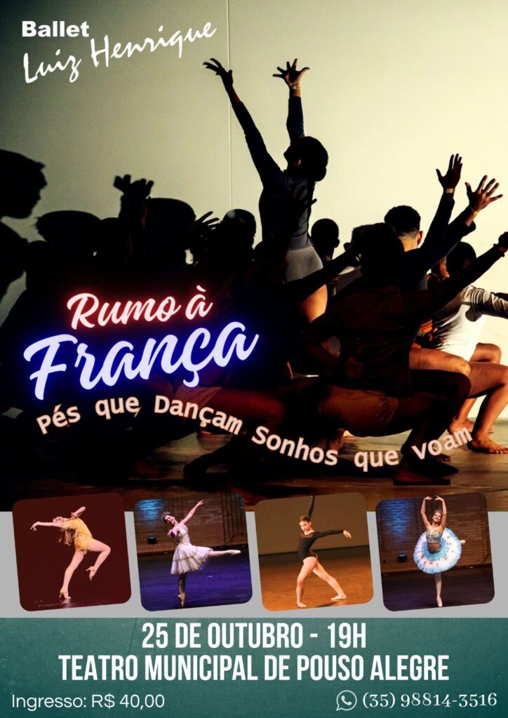 O Ballet Luiz Henrique realiza o espetáculo beneficente “Rumo à França: Pés que Dançam, Sonhos que Voam”, também sábado (25), às 19h, no Teatro Municipal. A apresentação vai arrecadar recursos para apoiar alunos que representarão Pouso Alegre em um festival internacional na França em 2026. Ingressos à venda pelo WhatsApp (35) 98814-3516.