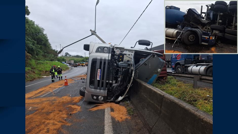 Tombamento seguido de batida entre as carretas deixou dois mortos, em Itapeva (MG). Combustível vazou na pista e tem cabo energizado no local.
