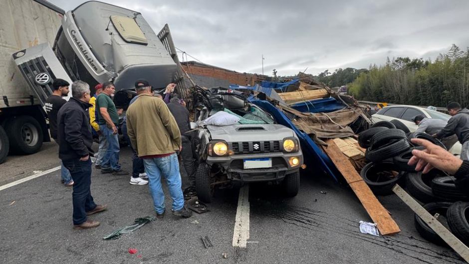 Uma carreta desgovernada atingiu veículos e tombou sobre um Suzuki Jimny na Fernão Dias, em Cambuí. O acidente aconteceu no km 905, cerca de 7h20 desta sexta-feira (31/10) e interdita a pista sentido BH, com congestionamento de 19 km. A Polícia Rodoviária Federal (PRF) confirma duas vítimas leves.