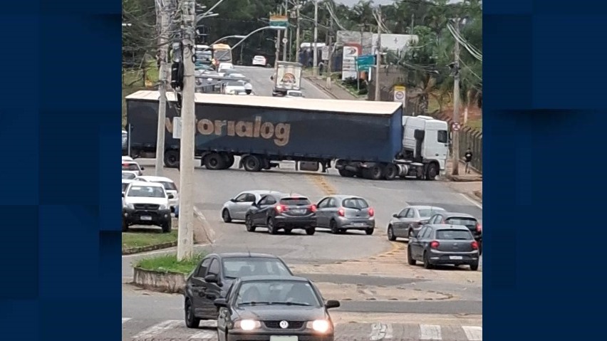 A imagem mostra fila de veículos atrás da carreta, até entrando na contramão para passar pela avenida ou acessar a entrada do bairro. Essa é a principal avenida de ligação dos bairros Jatobá, Jardim Ipê, Morumbi e regiões próximas á região central.