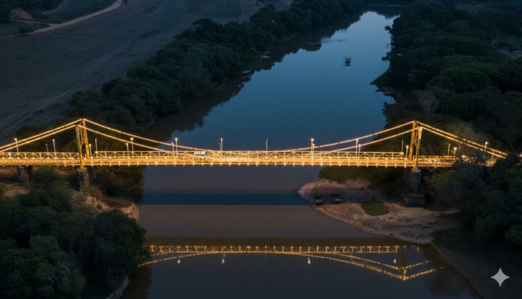 Estrutura Metálica Principal (Cabos): A ponte é sustentada por dezoito cabos de aço maciços ao longo de seus 132 metros de extensão. A engenharia da época era impressionante, pois cada um desses cabos pesava cerca de uma tonelada, demonstrando a robustez necessária para suportar o tráfego da época sobre o Rio Sapucaí.