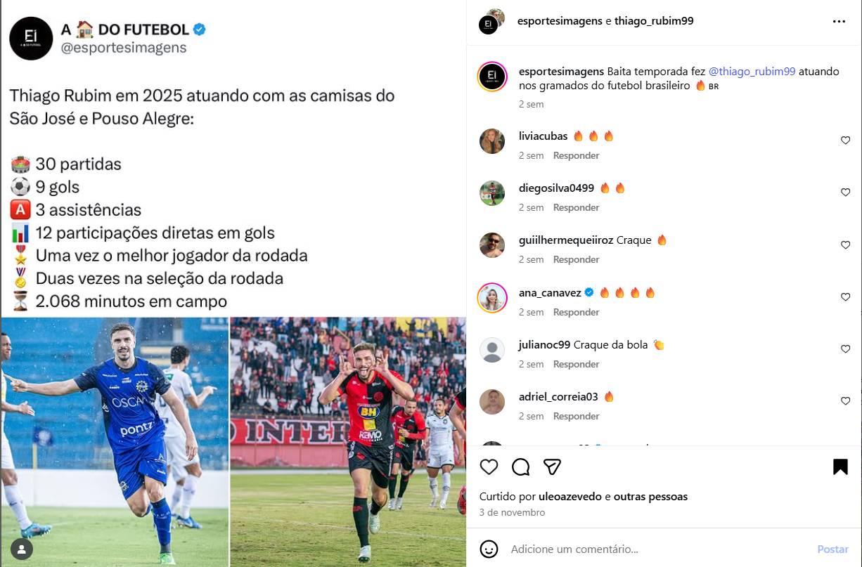 Segundo um levantamento feito pelo @esportesimagens, Thiago Rubim fez 30 partidas na temporada 2025 (pelo Pouso Alegre e pelo São José), marcando 9 gols, dando 3 assistências e participando diretamente de 12 gols. Ele foi ainda eleito o melhor jogador da rodada por uma vez. Veja detalhes: