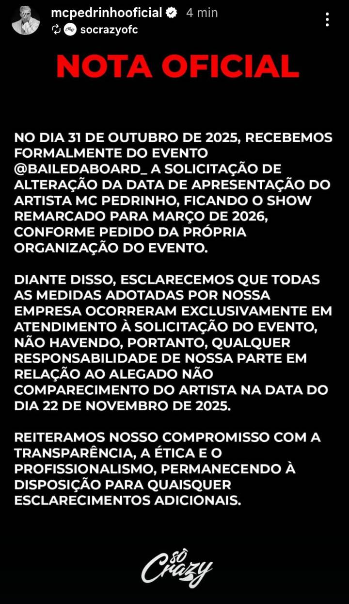 Já a equipe de MC Pedrinho se pronunciou por meio da empresa Socrazy, dizendo que receberem formalmente do evento “Baile da Board”, ainda em 31 de outubro, a solicitação para alteração da data de apresentação do artista. Segundo a empresa, o show teria ficado remarcado para março de 2026, conforme pedido da própria organização.
