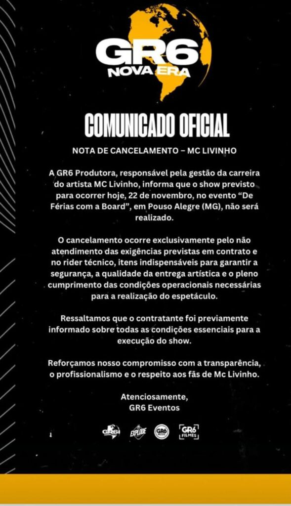 Segundo a empresa, os itens são indispensáveis para garantir segurança, qualidade da entrega artística e o pleno cumprimento das condições operacionais necessárias para realização do espetáculo. Ainda na nota, a empresa citou que o contratante foi previamente informado sobre as condições essenciais para execução do show. Veja: