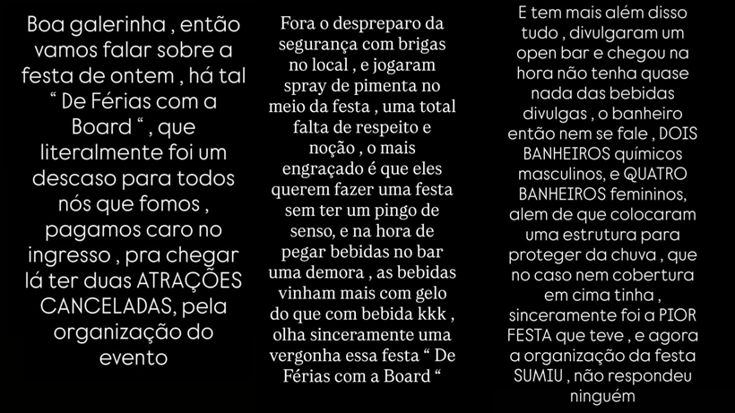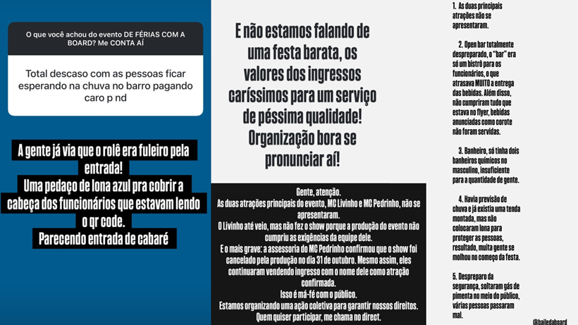 Participantes de uma festa funk estão cobrando posicionamento da organização do evento, intitulado “De Férias com a Board”, após os dois principais shows não acontecerem. Os cantores MC Livinho e MC Pedrinho não fizeram as apresentações previstas para a madrugada de domingo (23/11).