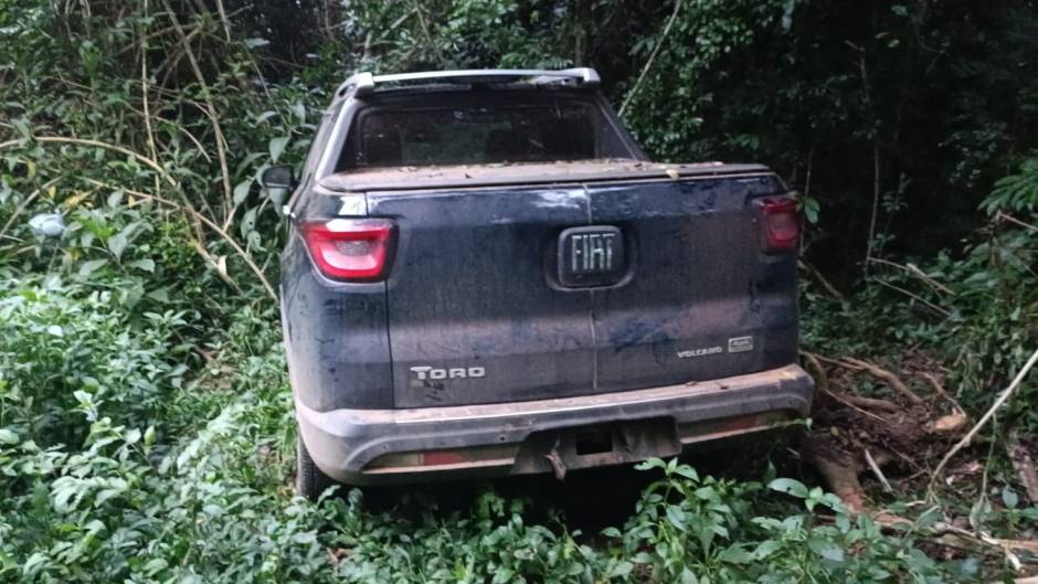 A picape foi flagrada por câmeras de segurança do sítio, assim que os criminosos chegaram. A PM disse que a picape estava sem placa dianteira, o que levantou suspeitas sobre a origem do veículo.