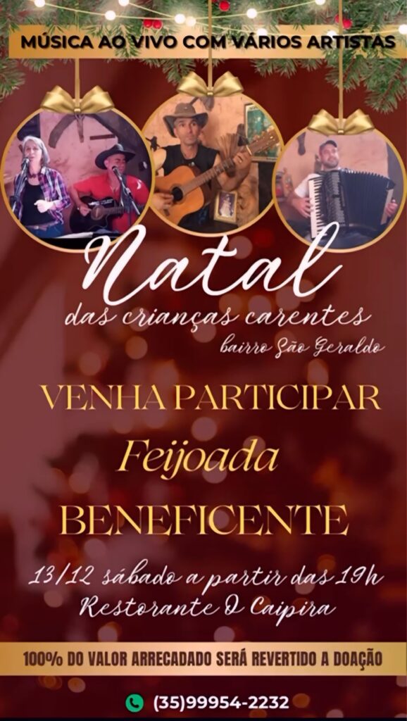 Saborear uma deliciosa feijoada mineira e ao mesmo tempo, ajudar crianças a ter presentes de Natal. Essa é a proposta da Feijoada Beneficente do ‘Restorante O Caipira’, que acontece a partir de 19h deste sábado (13/12).
