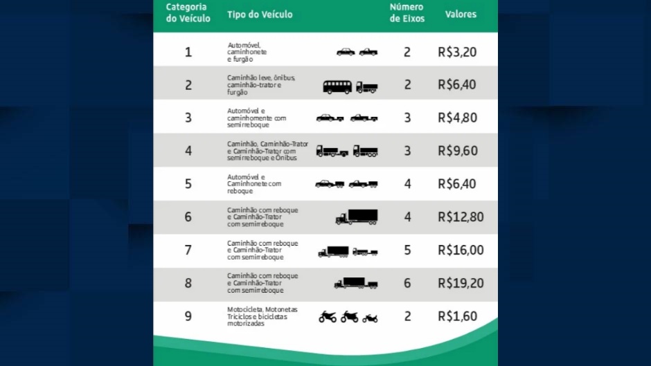 A mais cara é para caminhões com reboque e caminhão-trator com semirreboque. O valor que até esta quinta-feira (18/12) é de R$ 18,00 por eixo, sobe para R$ 19,20 a partir da meia-noite.