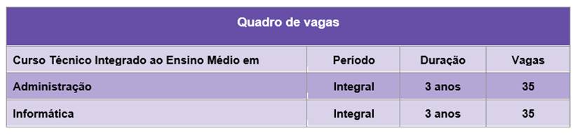 São oportunidades em cursos técnicos integrados ao ensino médio, nas áreas de Administração e Informática. Podem se inscrever estudantes que já concluíram o Ensino Fundamental.