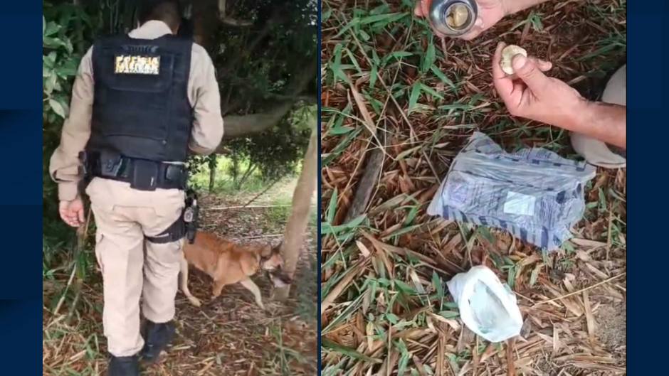O cão policial encontrou as drogas escondidas em saco de açúcar e embalagem plástica, em uma área de vegetação. A PM apreendeu porções de crack, maconha, LSD, balança de precisão, material para embalar drogas e um celular.