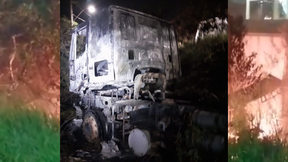 Um caminhão foi consumido por incêndio na noite desta quinta-feira (29/1), em Santa Rita do Sapucaí. O veículo estava em um pátio às margens da BR-459, no bairro Pôr-do-Sol.