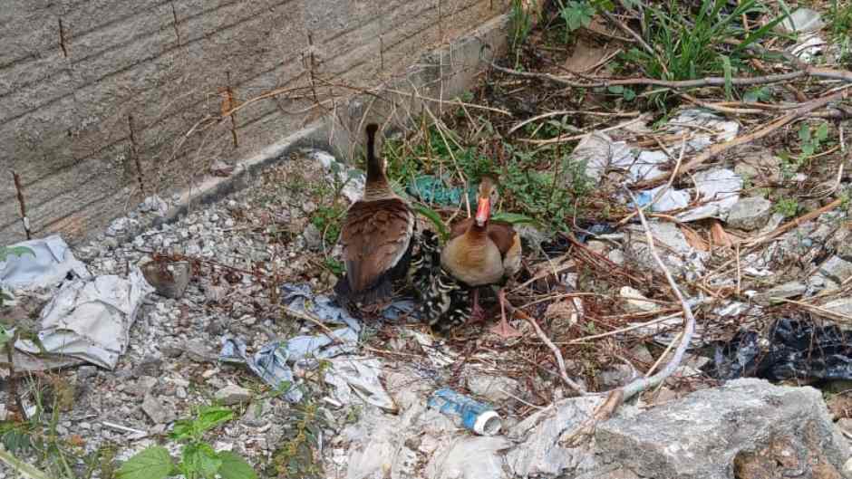 Família de marrecos se abrigam em terreno baldio após circular por rua do Faisqueira. Imagem Narciso Rodrigues.