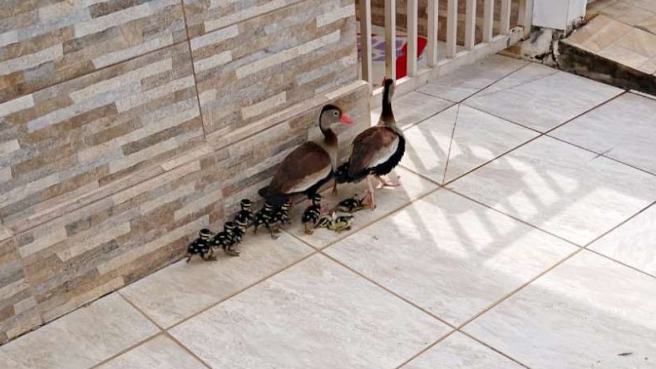 Família de marrecos circula tranquila pelo bairro Faisqueira