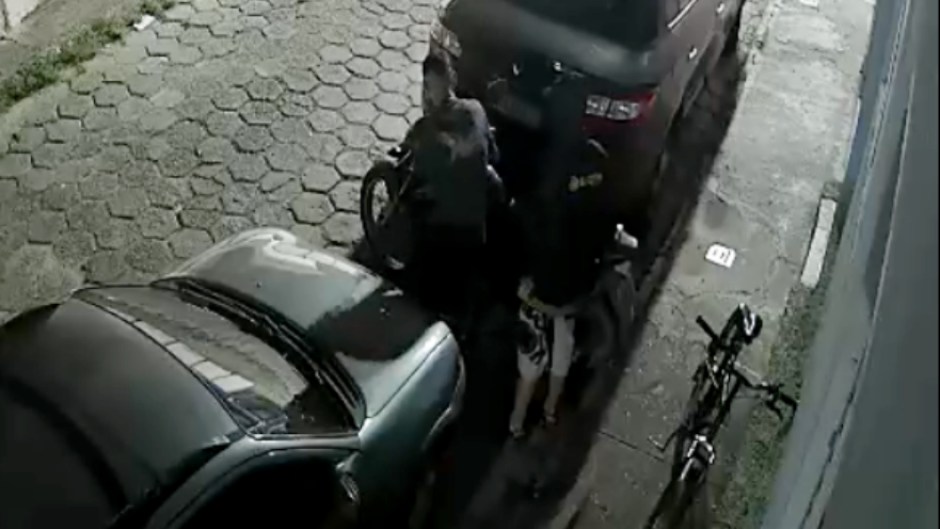 A imagem mostra um homem subir na moto, enquanto outro aguarda junto dele, em uma bicicleta. O criminoso sobe na moto e tenta ligar o veículo. O que está na bicicleta o ajuda. Depois o ladrão foge com a moto.