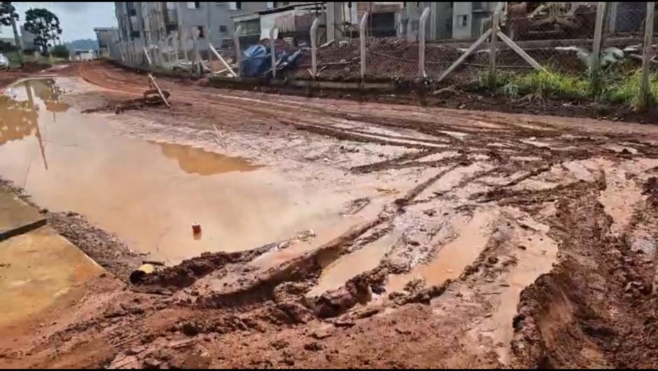 Moradora reclama que obra foi paralisada e mostra rua repleta de lama em frente à construção de condomínio popular da prefeitura.