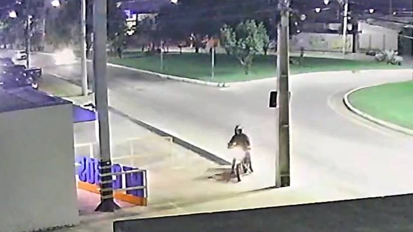 Veja que o homem passa pelo celular e percebe que ele está jogado ao chão. Ele para a moto mais a frente, volta a pé e recolhe o aparelho do chão, indo embora em seguida.