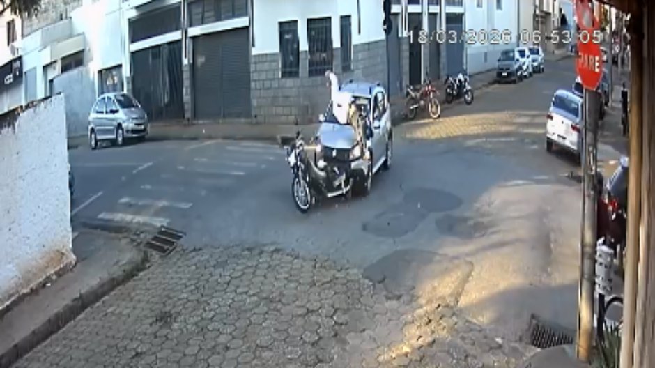 Um motociclista ficou ferido em um batida entre a moto CG 160 Start e um Renault Sandero, no Centro de Santa Rita do Sapucaí. O acidente foi flagrado por uma câmera de segurança, antes de 7h desta quarta-feira (18/3).