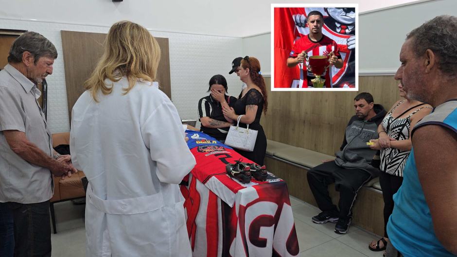 Viúva de jogador assassinado chora ao lado de caixão coberto com bandeira, chuteiras e camisas do CRB Bangu. Imagens Terra do Mandu/cedida pela famíilia.
