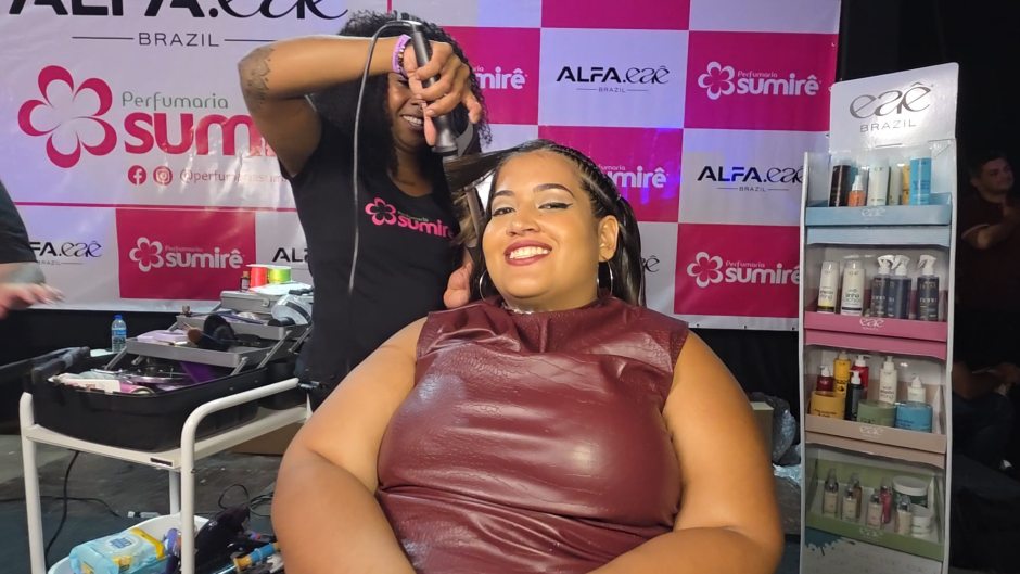 Daniela recebia os cuidados da EAÊ Brazil enquanto assistia o show direto do salão. Ela sentiu o diferencial de ter produtos para nutrir e cuidar conforme a necessidade dos cabelos, desde o interior dos fios. “Eu achei muito legal ter esse pré antes de fazer o meu cabelo.”