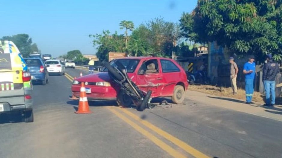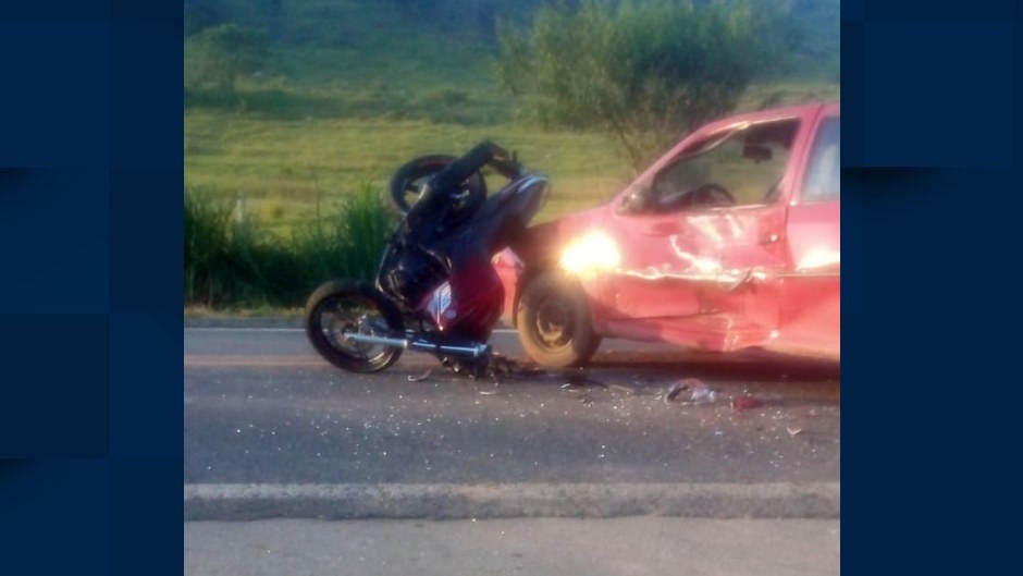 A moto vinha pela BR-459 e bateu na lateral do carro, no km 127. O motociclista contou à Polícia Militar Rodoviária (PMRv) que o carro entrou repentinamente na pista e ele não teve como desviar ou parar.