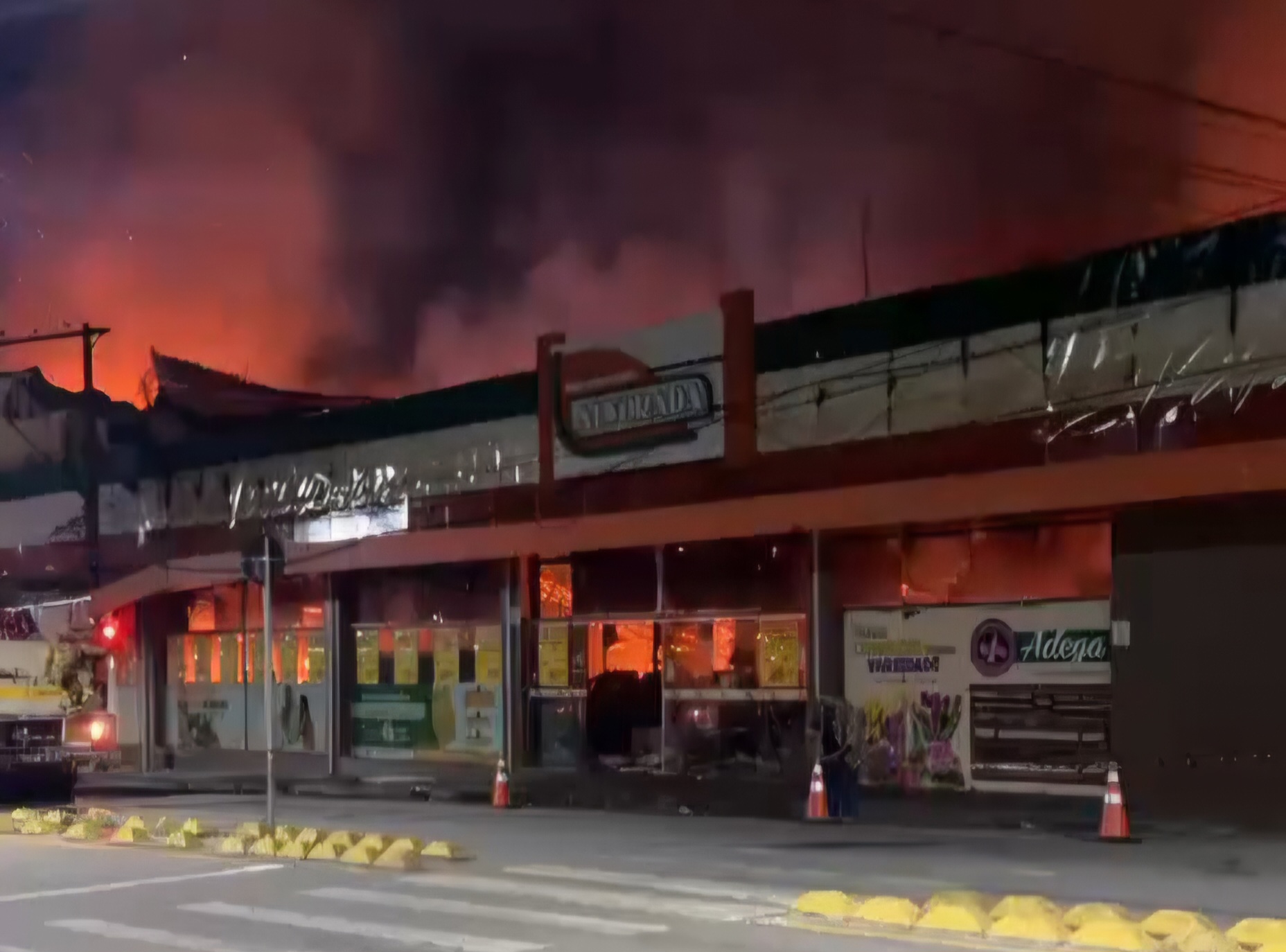 Supermercado Alvorada é destruído por incêndio durante a madrugada de 20 de abril. Imagem redes sociais.
