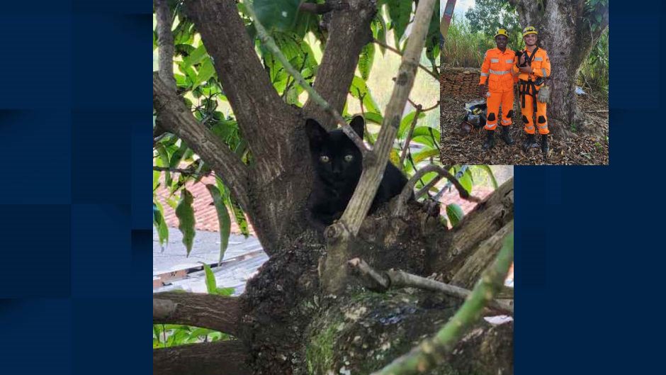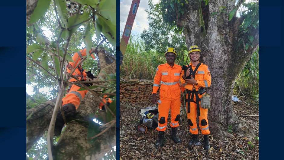 A árvore em que o animal estava é uma mangueira. Segundo os bombeiros, ele não conseguia descer sozinho e ficou em situação de risco. Técnicas de salvamento em altura e os equipamentos da corporação garantiram a segurança, com o foco de fazer acesso seguro ao local da árvore onde ele estava.